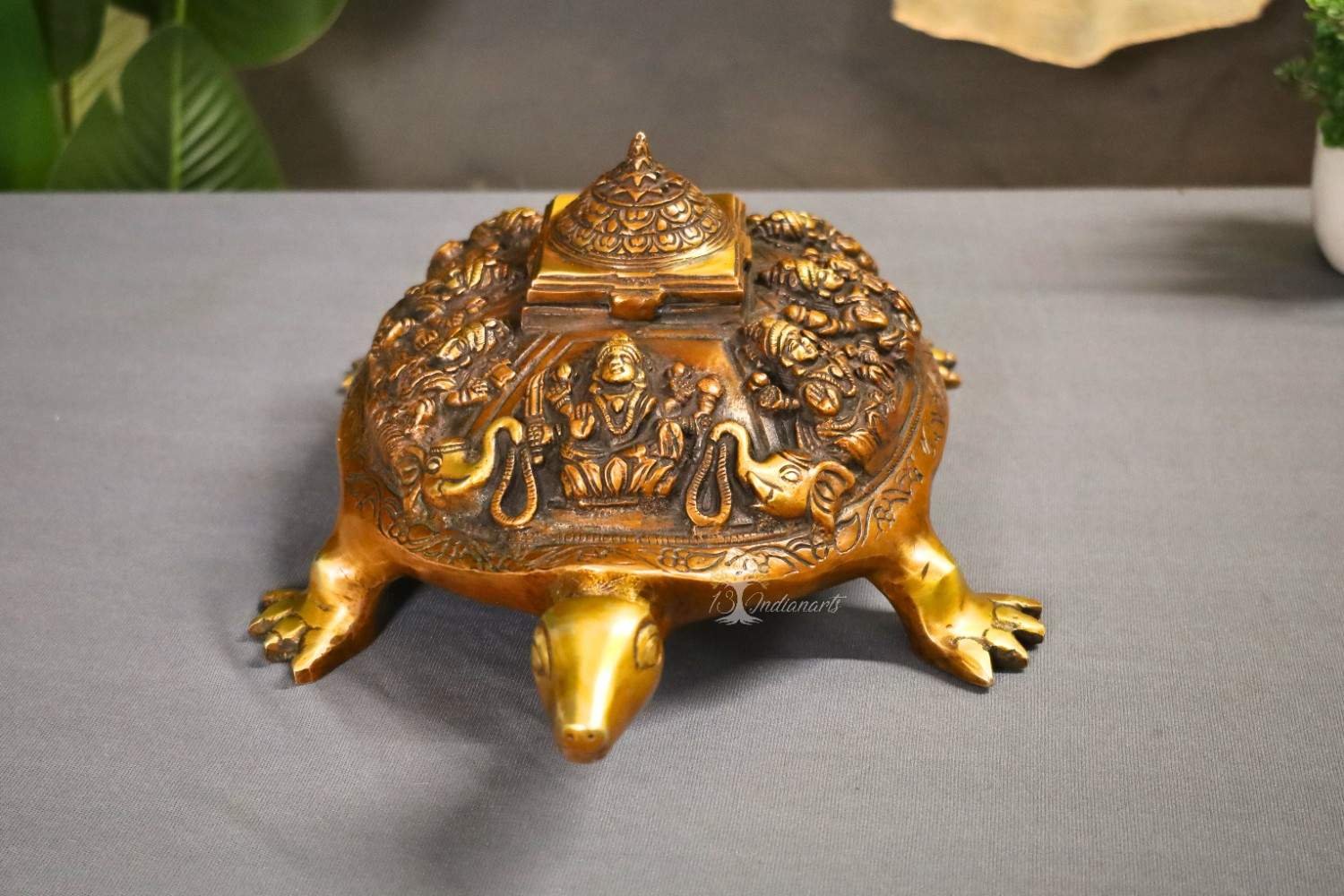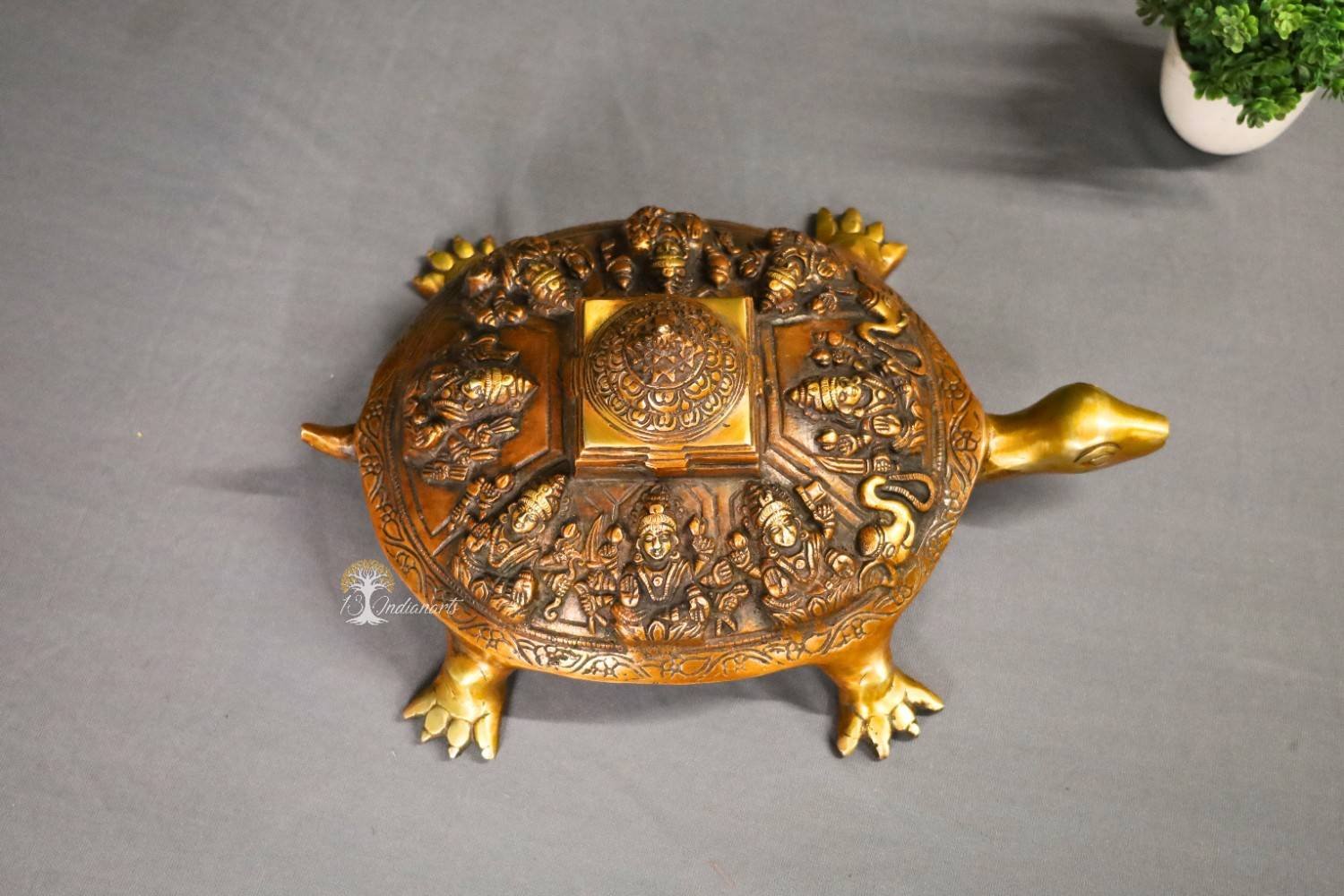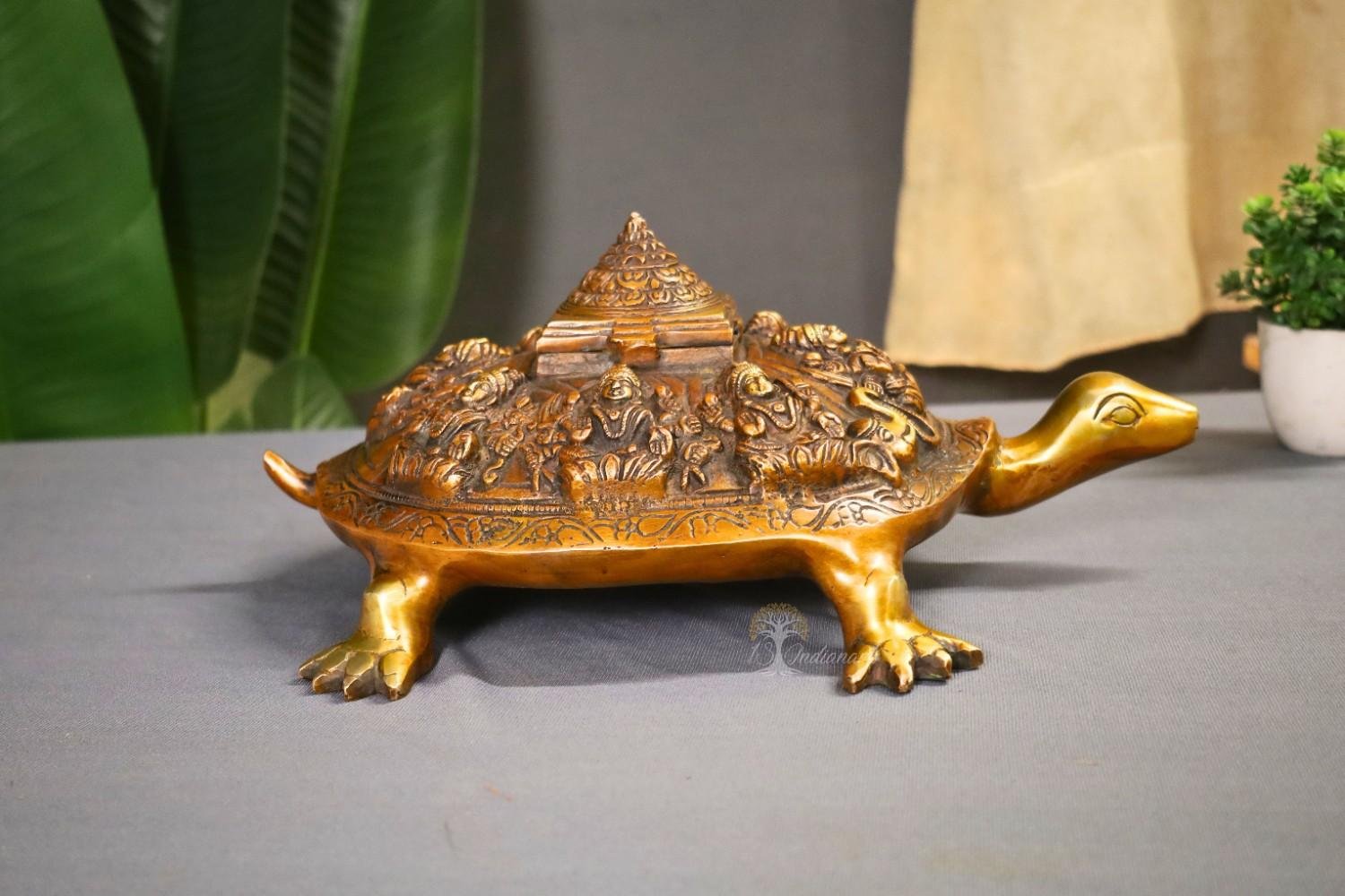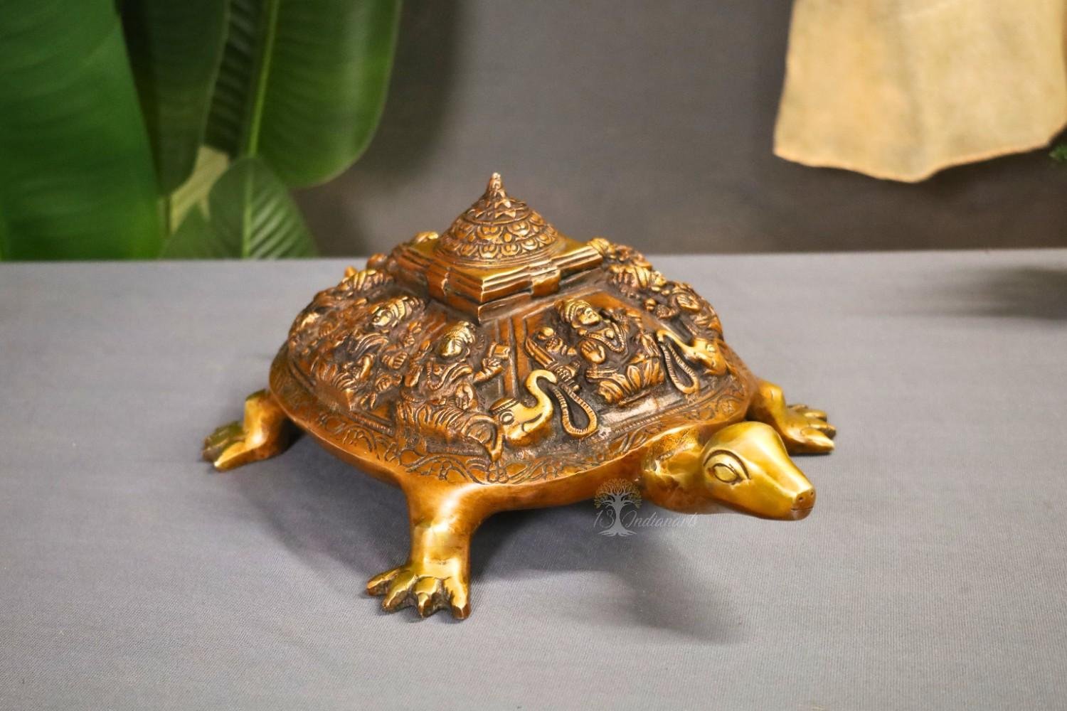 The tortoise (Kurma avatar) symbolizes stability and grounding, while the intricate carvings of Ashtalakshmi invoke blessings of prosperity, abundance, and positive energy in all aspects of life. Designed with detailed craftsmanship and a rich antique finish, this piece is both spiritually powerful and visually striking.