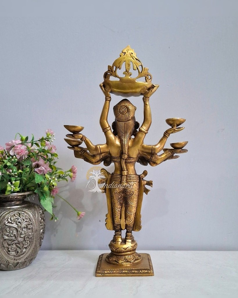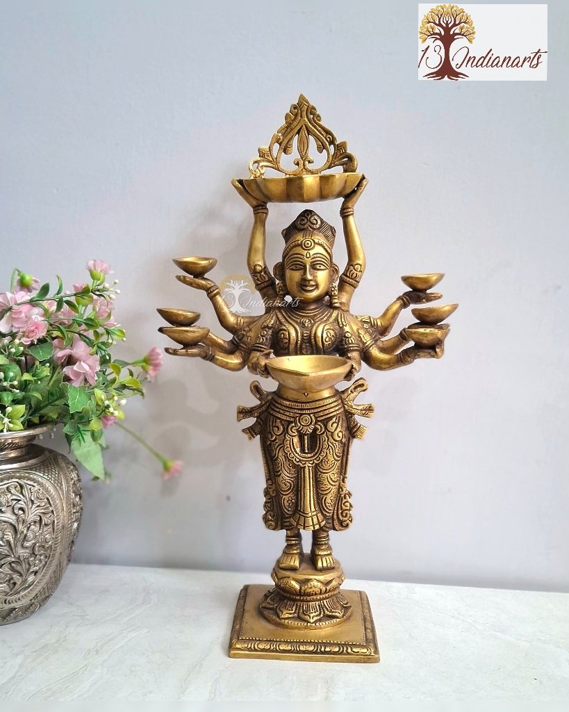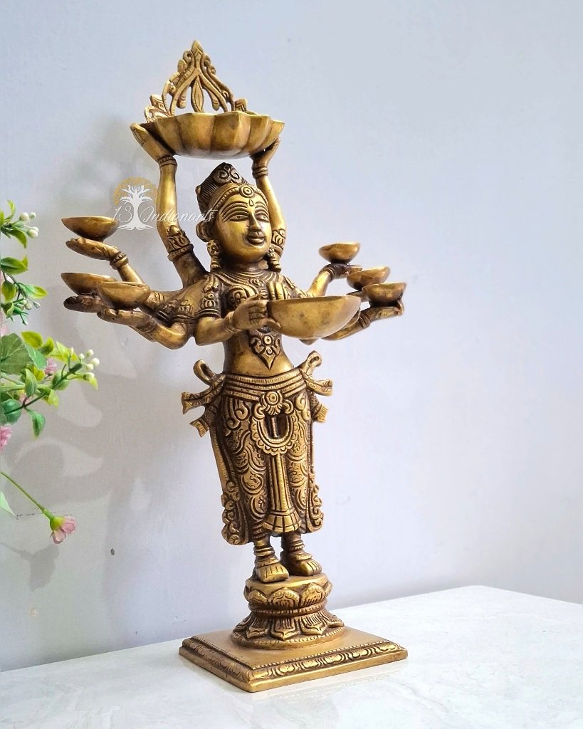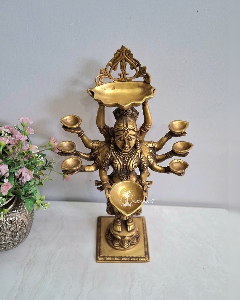 The lady figurine diya painted with vintage finish has eight diya holders. The diya is a perfect combination of functionality and esthetic decor.